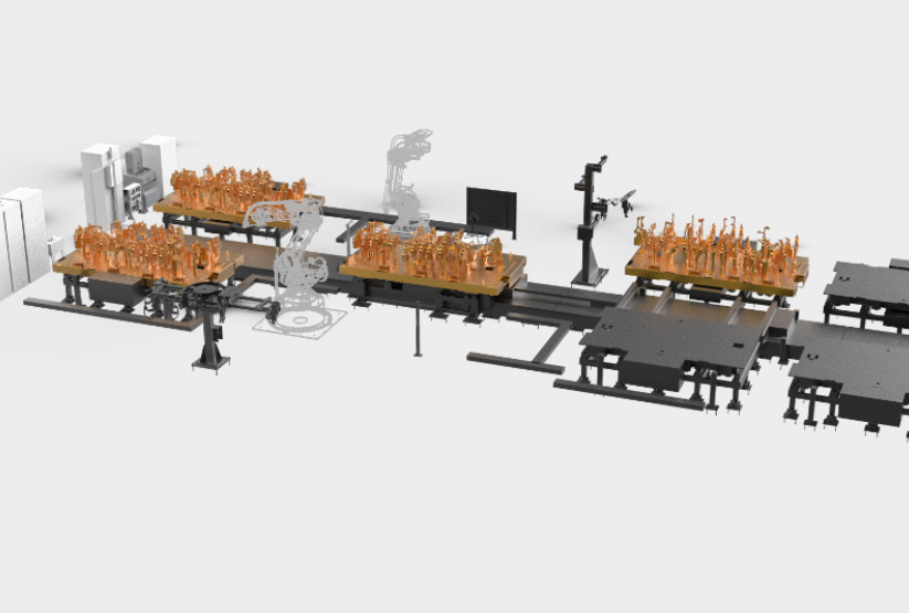 通過轉(zhuǎn)臺及夾具庫切換技術(shù),實現(xiàn)側(cè)圍線多車型混線生產(chǎn)。側(cè)圍線內(nèi)采用工業(yè)機器人,積放式輸送機等自動化設備,實現(xiàn)焊接、涂膠、搬運等全自動化生產(chǎn)。